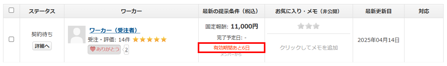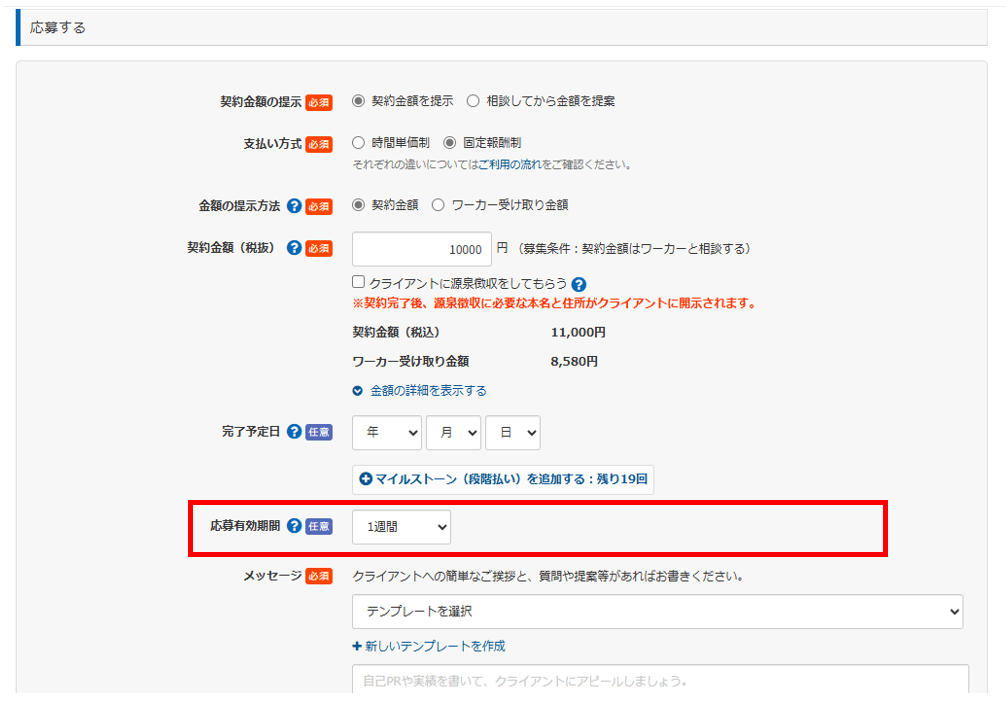 ・応募時に「応募有効期間」を設定できる仕組みがあります。 ・「応募有効期間」を設定すると、クライアントの画面上に返信期限が表示されます。